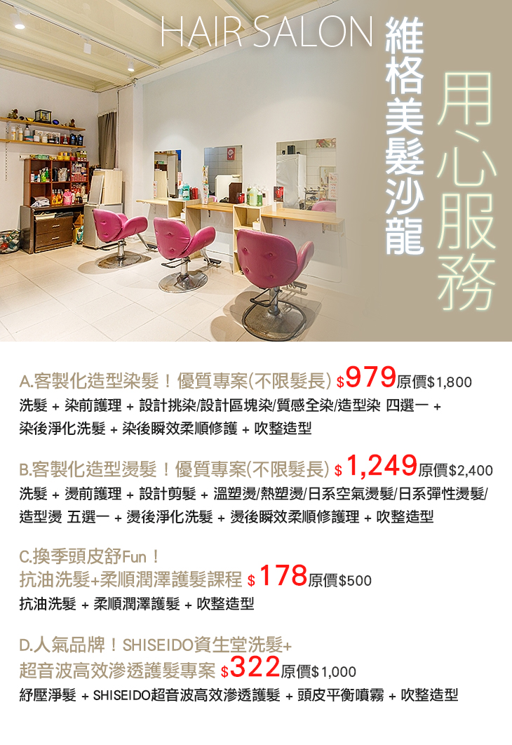 A.客製化造型染髮!優質專案(不限髮長) / B.客製化造型燙髮!優質專案(不限髮長) / C.換季頭皮舒Fun!抗油洗髮+柔順潤澤護髮課程 / D.人氣品牌!SHISEIDO資生堂洗髮+超音波高效滲透護髮專案