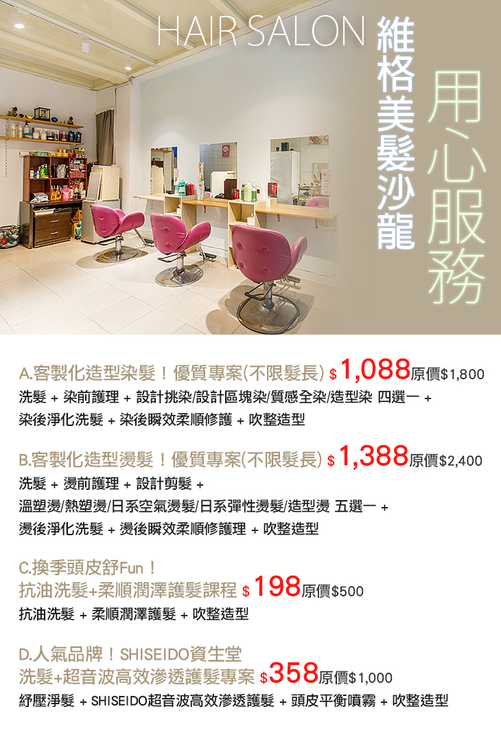 A.客製化造型染髮!優質專案(不限髮長) / B.客製化造型燙髮!優質專案(不限髮長) / C.換季頭皮舒Fun!抗油洗髮+柔順潤澤護髮課程 / D.人氣品牌!SHISEIDO資生堂洗髮+超音波高效滲透護髮專案