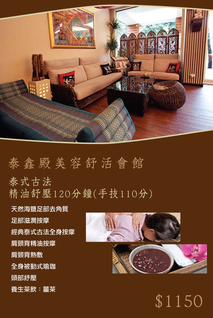 這次推出的〝泰式古法精油舒壓〞120分鐘,體驗古泰皇貴族的最高禮遇,藉由按壓與伸展,給予身心最暢快的享受!