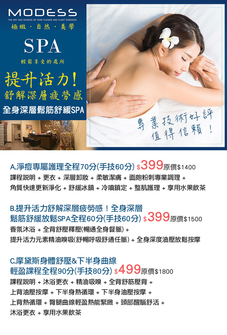 A.淨痘專屬護理全程70分(手技60分) / B.提升活力舒解深層疲勞感!全身深層鬆筋舒緩放鬆SPA全程60分(手技60分) / C.摩黛斯身體舒壓&下半身曲線輕盈課程全程90分(手技80分)