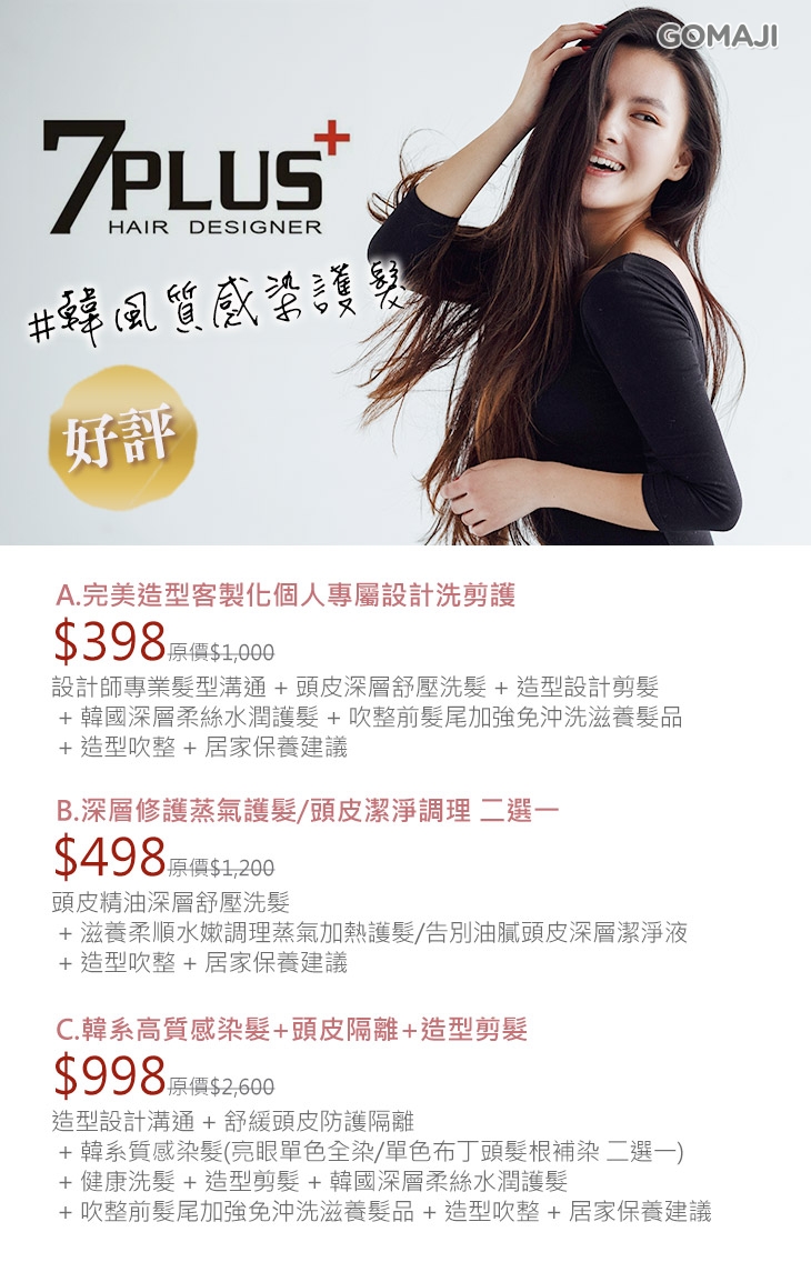 A.完美造型客製化個人專屬設計洗剪護 / B.深層修護蒸氣護髮/頭皮潔淨調理 二選一 / C.韓系高質感染髮+頭皮隔離+造型剪髮