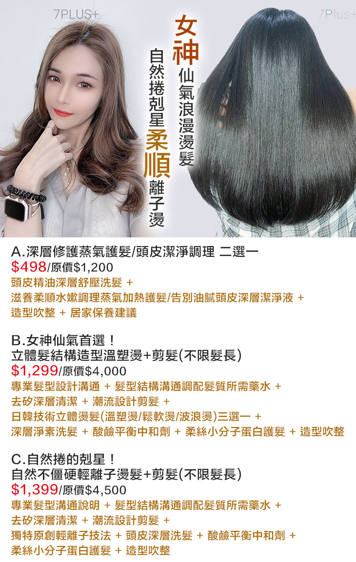 A.深層修護蒸氣護髮/頭皮潔淨調理 二選一 / B.女神仙氣首選!立體髮結構造型溫塑燙+剪髮(不限髮長) / C.自然捲的剋星!自然不僵硬輕離子燙髮+剪髮(不限髮長)