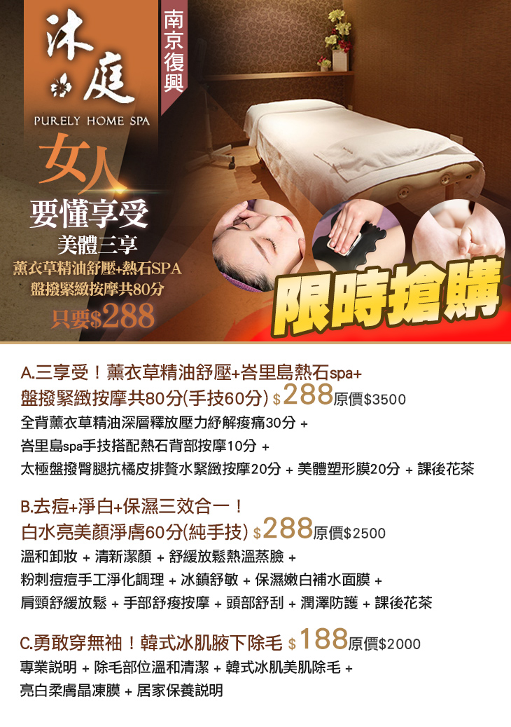 A.三享受!薰衣草精油舒壓+峇里島熱石spa+盤撥緊緻按摩共80分(手技60分) / B.去痘+淨白+保濕三效合一!白水亮美顏淨膚60分(純手技) / C.勇敢穿無袖!韓式冰肌腋下除毛