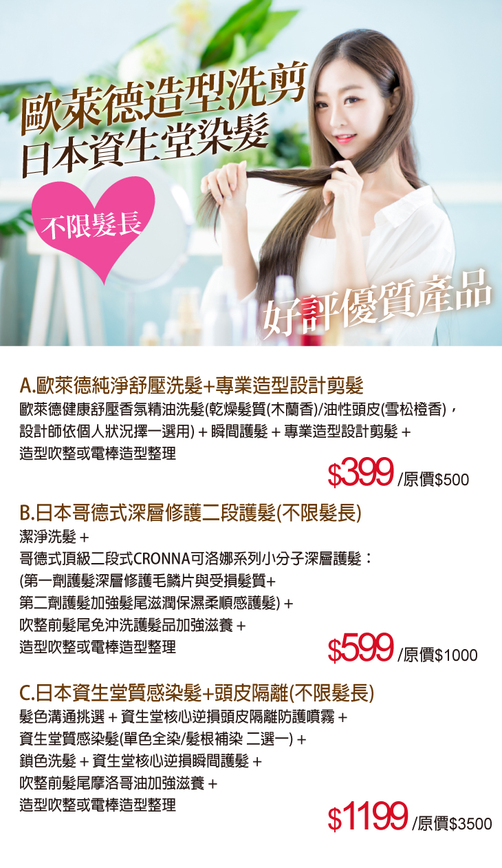 A.歐萊德純淨舒壓洗髮+專業造型設計剪髮 / B.日本哥德式深層修護二段護髮(不限髮長) / C.日本資生堂質感染髮+頭皮隔離(不限髮長)