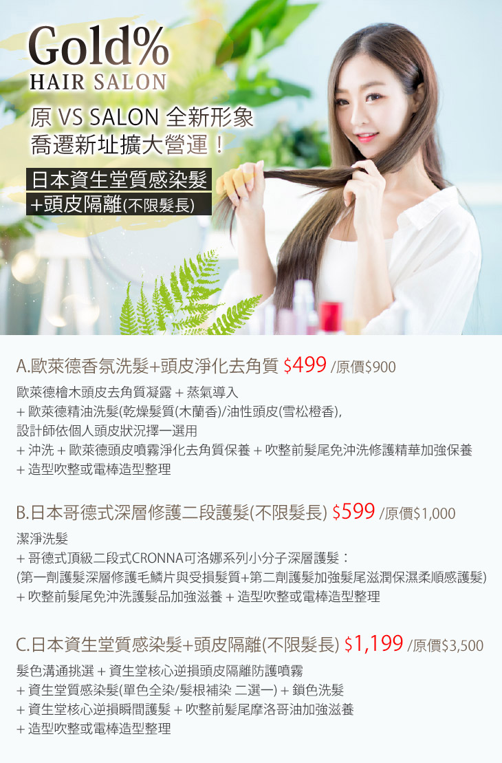 A.歐萊德香氛洗髮+頭皮淨化去角質 / B.日本哥德式深層修護二段護髮(不限髮長) / C.日本資生堂質感染髮+頭皮隔離(不限髮長)