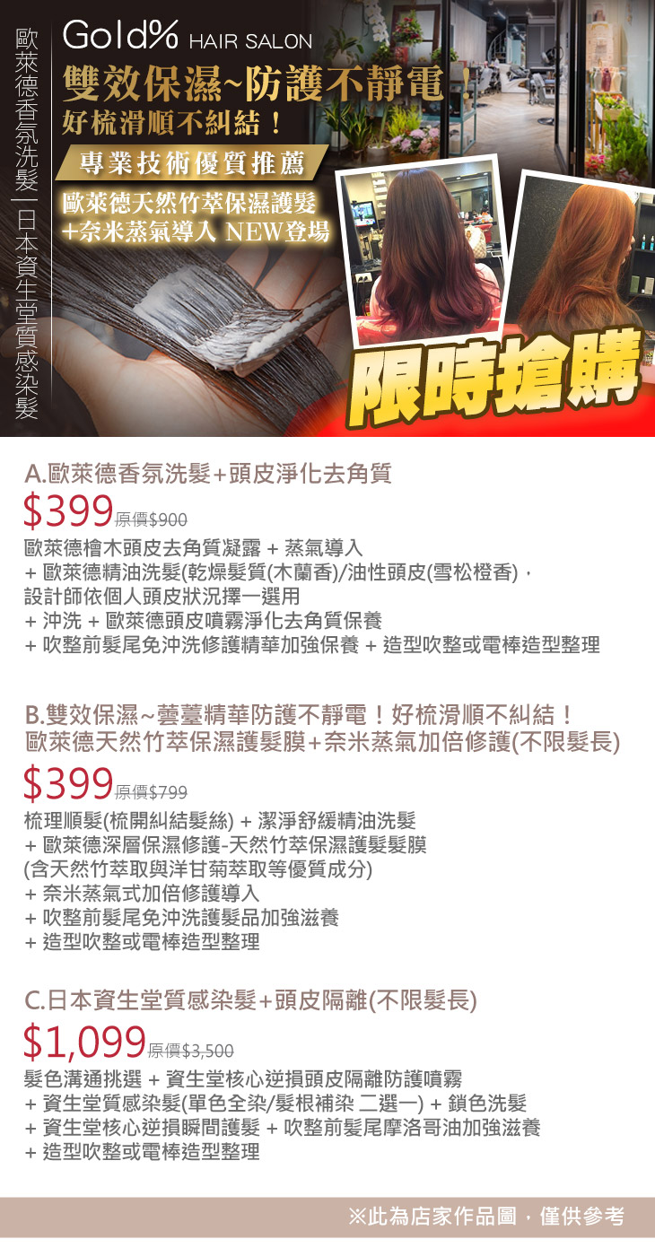 A.歐萊德香氛洗髮+頭皮淨化去角質 / B.雙效保濕~蕓薹精華防護不靜電!好梳滑順不糾結!歐萊德天然竹萃保濕護髮膜+奈米蒸氣加倍修護(不限髮長) / C.日本資生堂質感染髮+頭皮隔離(不限髮長)