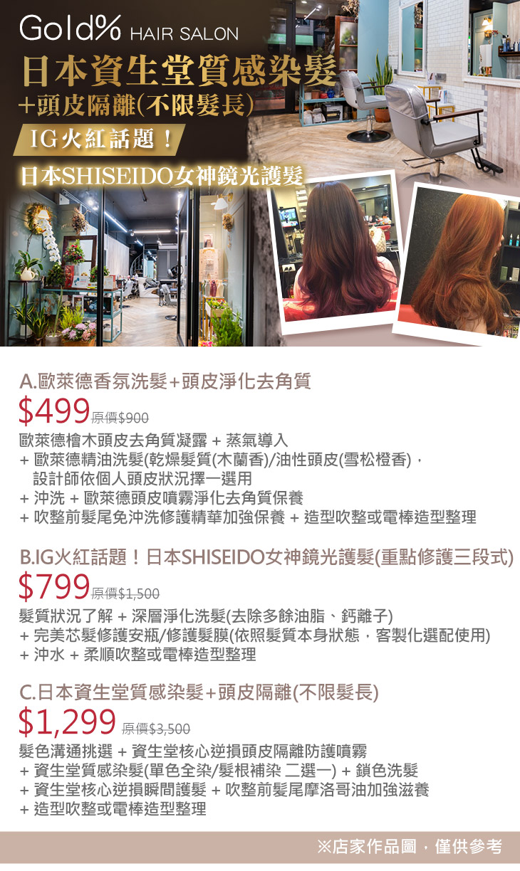 A.歐萊德香氛洗髮+頭皮淨化去角質 / B.IG火紅話題!日本SHISEIDO女神鏡光護髮(重點修護三段式) / C.日本資生堂質感染髮+頭皮隔離(不限髮長)
