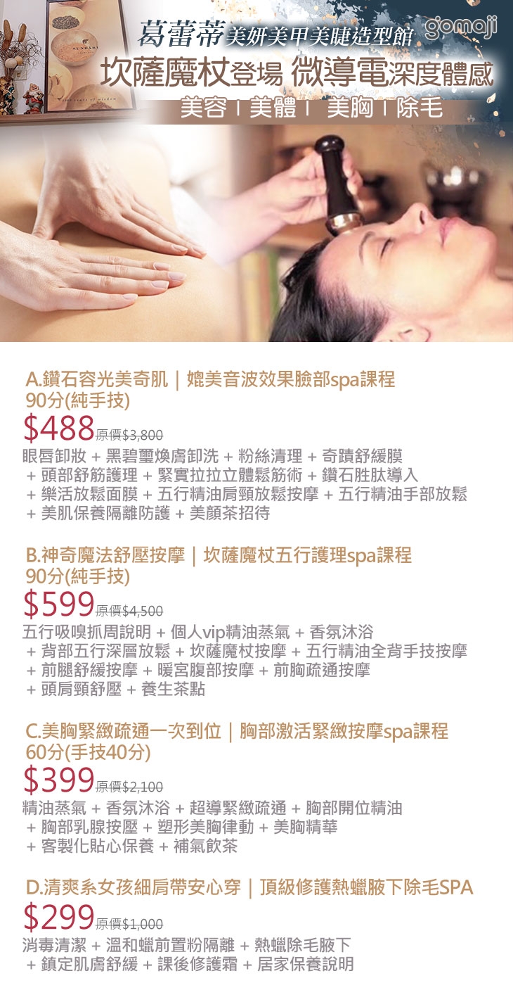 A.鑽石容光美奇肌|媲美音波效果臉部spa課程90分(純手技) / B.神奇魔法舒壓按摩|坎薩魔杖五行護理spa課程90分(純手技) / C.美胸緊緻疏通一次到位|胸部激活緊緻按摩60分(手技40分) / D.清爽系女孩細肩帶安心穿|頂級修護熱蠟腋下除毛SPA