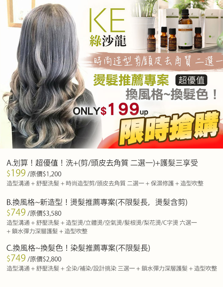 A.划算!超優值!洗+(剪/頭皮去角質 二選一)+護髮三享受 / B.換風格~新造型!燙髮推薦專案(不限髮長,燙髮含剪) / C.換風格~換髮色!染髮推薦專案(不限髮長)