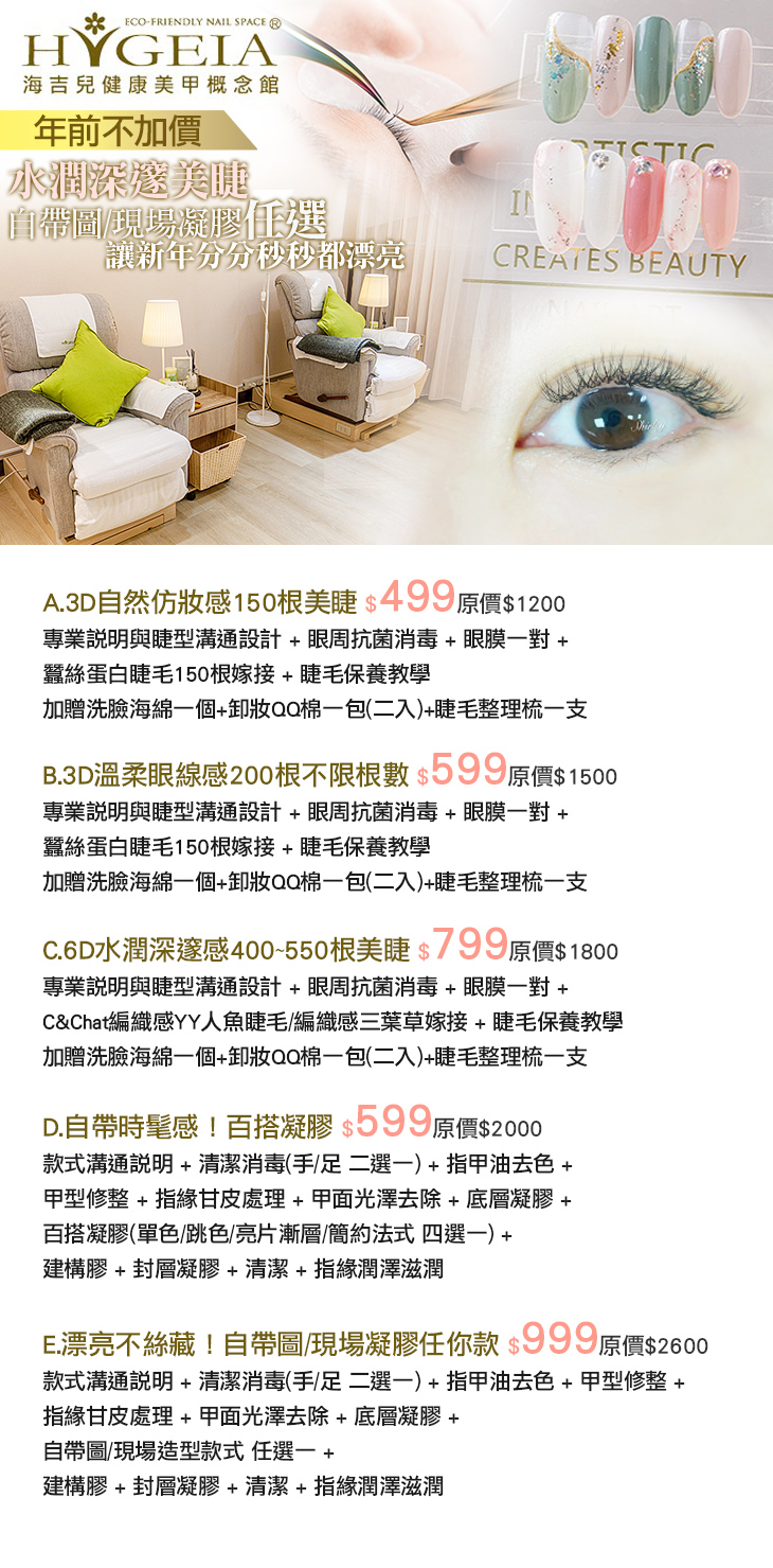 A.3D自然仿妝感150根美睫 / B.3D溫柔眼線感200根不限根數 / C.6D水潤深邃感400~550根美睫 / D.自帶時髦感!百搭凝膠 / E.漂亮不絲藏!自帶圖/現場凝膠任你款