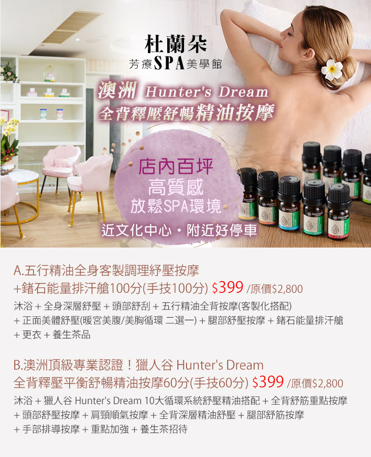A.五行精油全身客製調理紓壓按摩+鍺石能量排汗艙100分(手技100分) / B.澳洲頂級專業認證!獵人谷 Hunter's Dream 全背釋壓平衡舒暢精油按摩60分(手技60分)