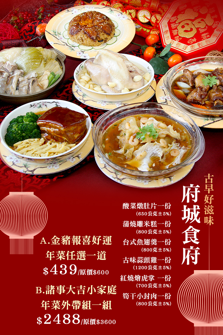 您總是為了過年期間的桌上佳餚而苦惱嗎?快來府城食府享受主廚為您精心準備的團圓年菜吧!酸菜燉肚片、蒲燒雕米糕、古味蒜頭雞等多樣美味菜色等您來品嚐!