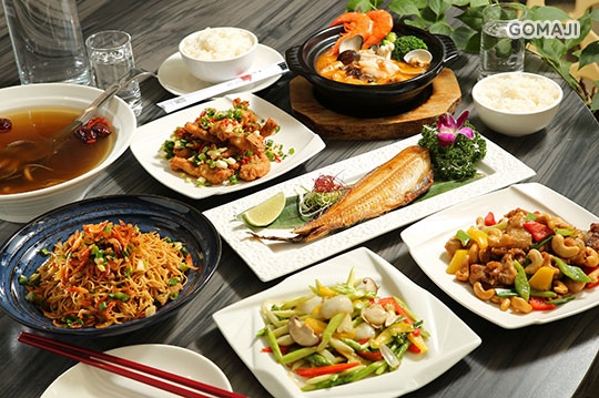 北海道花魚一夜干一份 + 腰果雞丁/椒鹽排骨/糖醋魚柳/客家小炒/泡菜松阪豬/香根牛肉絲 任選二 + 宮保皮蛋豆腐/蟹黃豆腐煲/古早味肉末豆腐/百合綠蘆筍/樹子高麗菜/青炒空心菜 任選二 + 櫻花蝦麵線一份 + 主廚湯品一份 + 白飯四碗