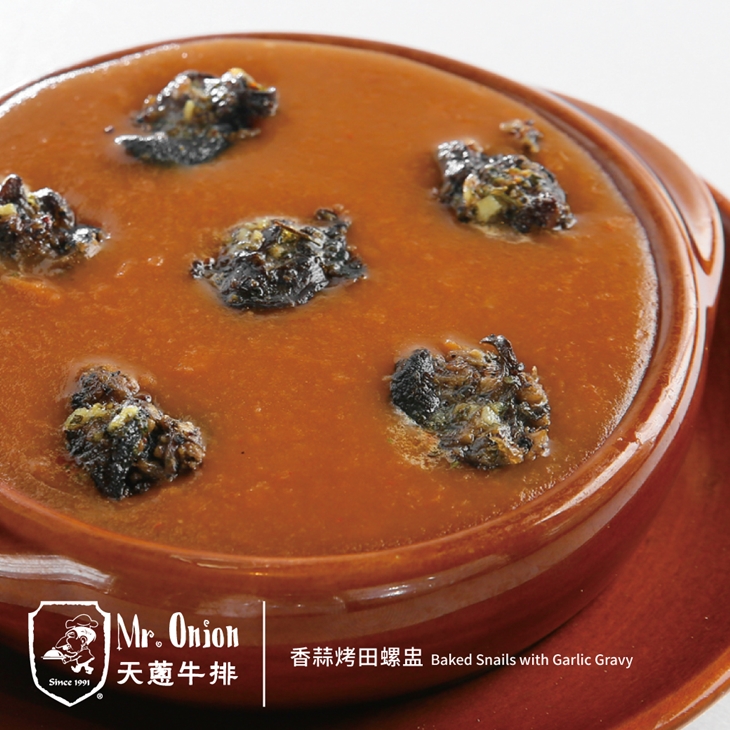 田螺先使用特殊香料炒香,在加入黑胡椒粒、牛肉原汁、蒜頭、奶油等佐料炙烤,一端上桌,惹人開胃的濃厚蒜香味便撲鼻而來。單吃螺肉軟嫩入味,淡淡黑胡椒香,增添了一絲迷人氣息,以醬汁沾著酥烤香蒜麵包一同享用,更是別有一番風味,兩種不同的吃法,從前菜開始,天蔥就給您大飽口福的享受!