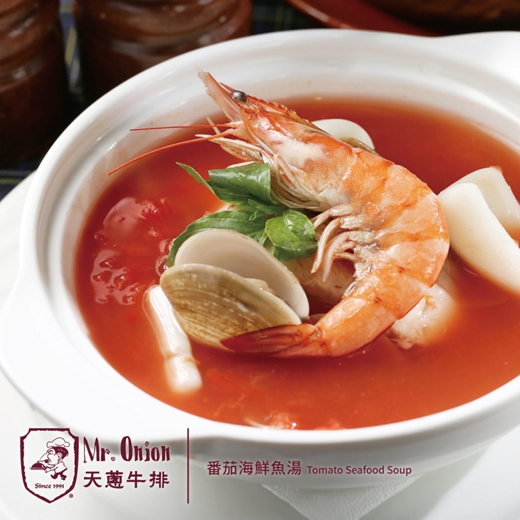 天蔥的人氣招牌!將義式香料、多汁蕃茄、鮮美豐富的什錦海鮮料放入雞高湯中文火細燉,湯頭微酸帶甘,溫醇順口,多樣的新鮮海料,讓湯品整體不僅充滿口感層次,也十分有飽足度,深受顧客們的喜愛。