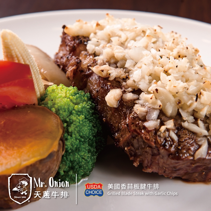 選用美國藍絲帶品牌的板腱牛,經過純安格斯牛種認證,細緻高級的口感品質有保證!肉質柔嫩的板腱牛排,透過主廚巧手香煎,讓均勻的油花在熱鐵板上滋滋作響,散發馥郁的牛油香,再鋪上滿滿的香蒜擺盤上桌,芬芳四溢令人垂涎三尺,迫不及待拿起刀叉享用!