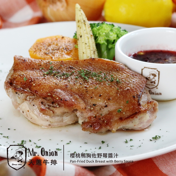 挑選上等的櫻桃鴨胸,將外皮煎至香酥薄脆、色澤誘人,鮮嫩的肉質,封存了滿滿的精華肉汁,吃起來多汁彈牙又清甜鮮美,沒有一絲鴨腥味。上菜時,僅以香料簡單調味,讓鴨胸原有的鮮美完整呈現,您可以先品嚐一口原味鴨肉,細細感受其中香氣,再沾上特製的酸甜野莓醬汁品味,充滿新意的滋味,別有一番風韻,您一定會喜歡!