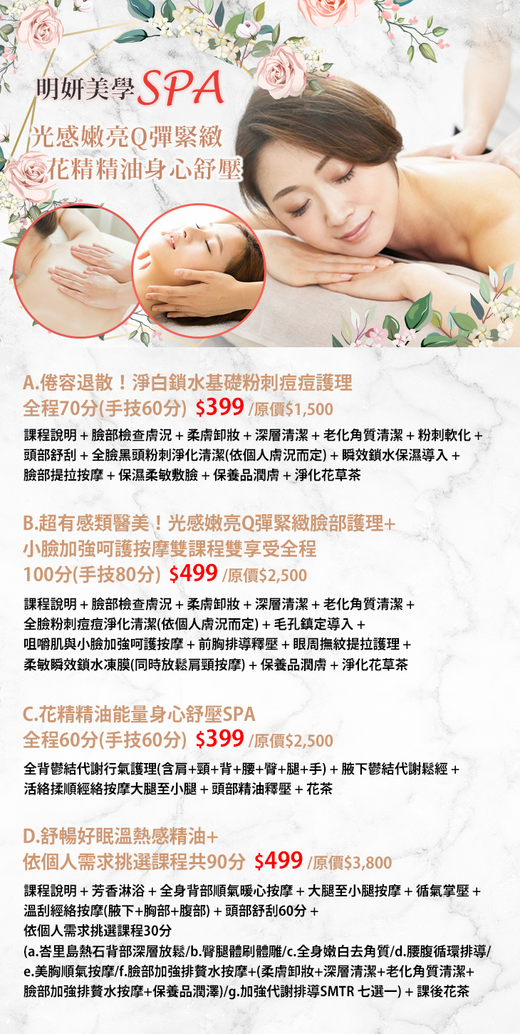 A.倦容退散!淨白鎖水基礎粉刺痘痘護理全程70分(手技60分) / B.超有感類醫美!光感嫩亮Q彈緊緻臉部護理+小臉加強呵護按摩雙課程雙享受全程100分(手技80分) / C.花精精油能量身心舒壓SPA全程60分(手技60分) / D.舒暢好眠溫熱感精油+依個人需求挑選課程共90分