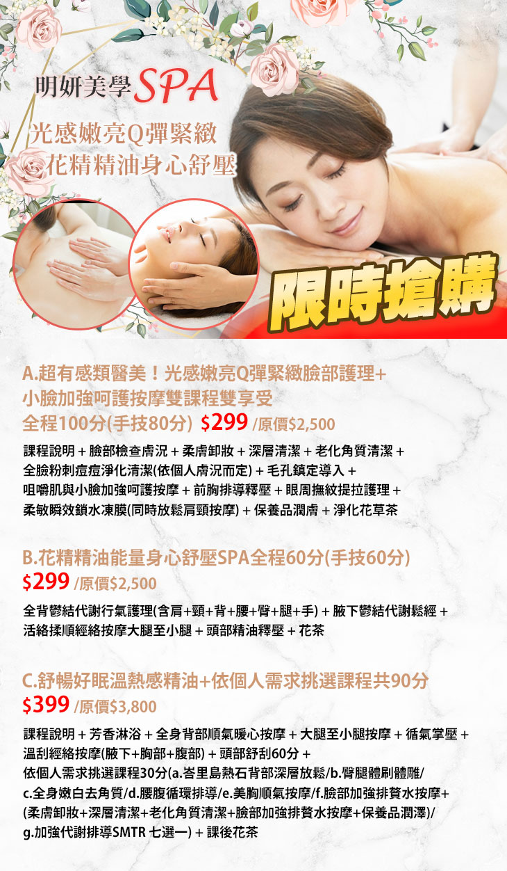 A.超有感類醫美!光感嫩亮Q彈緊緻臉部護理+小臉加強呵護按摩雙課程雙享受全程100分(手技80分) / B.花精精油能量身心舒壓SPA全程60分(手技60分) / C.舒暢好眠溫熱感精油+依個人需求挑選課程共90分