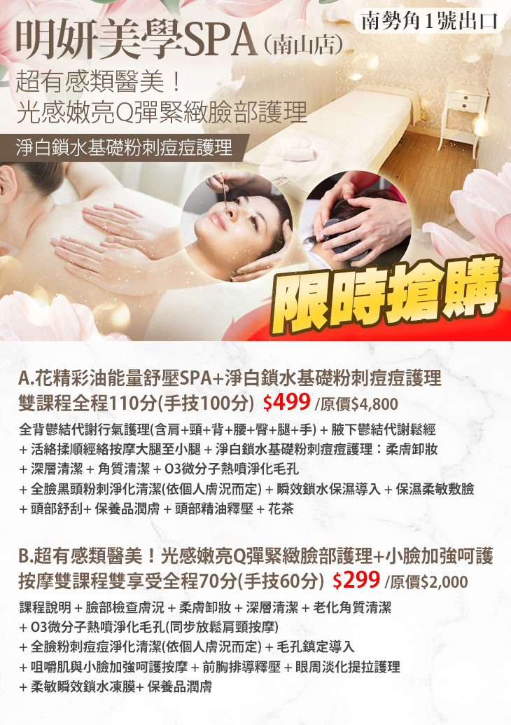 A.花精彩油能量舒壓SPA+淨白鎖水基礎粉刺痘痘護理雙課程全程110分(手技100分) / B.超有感類醫美!光感嫩亮Q彈緊緻臉部護理+小臉加強呵護按摩雙課程雙享受全程70分(手技60分)