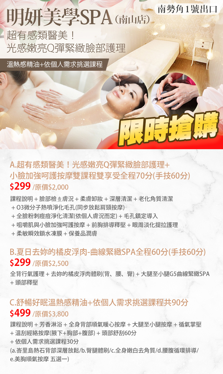A.超有感類醫美!光感嫩亮Q彈緊緻臉部護理+小臉加強呵護按摩雙課程雙享受全程70分(手技60分) / B.夏日去妳的橘皮浮肉-曲線緊緻SPA全程60分(手技60分) / C.舒暢好眠溫熱感精油+依個人需求挑選課程共90分