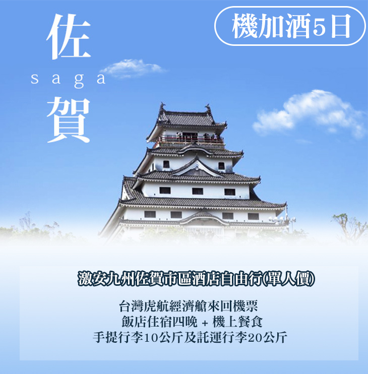 激安九州佐賀市區酒店自由行(單人價)〈含台灣虎航經濟艙來回機票 + 飯店住宿四晚 + 機上餐食 + 手提行李10公斤及託運行李20公斤〉