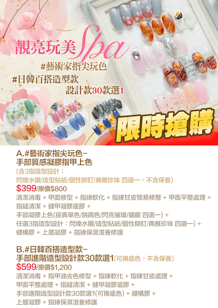 【靚亮玩美SPA(美甲部)】感謝麻吉們熱烈搶購,已全數賣光光。