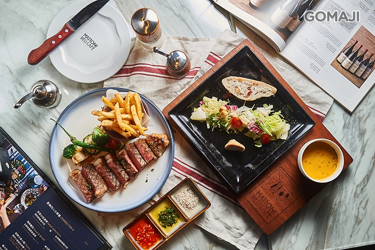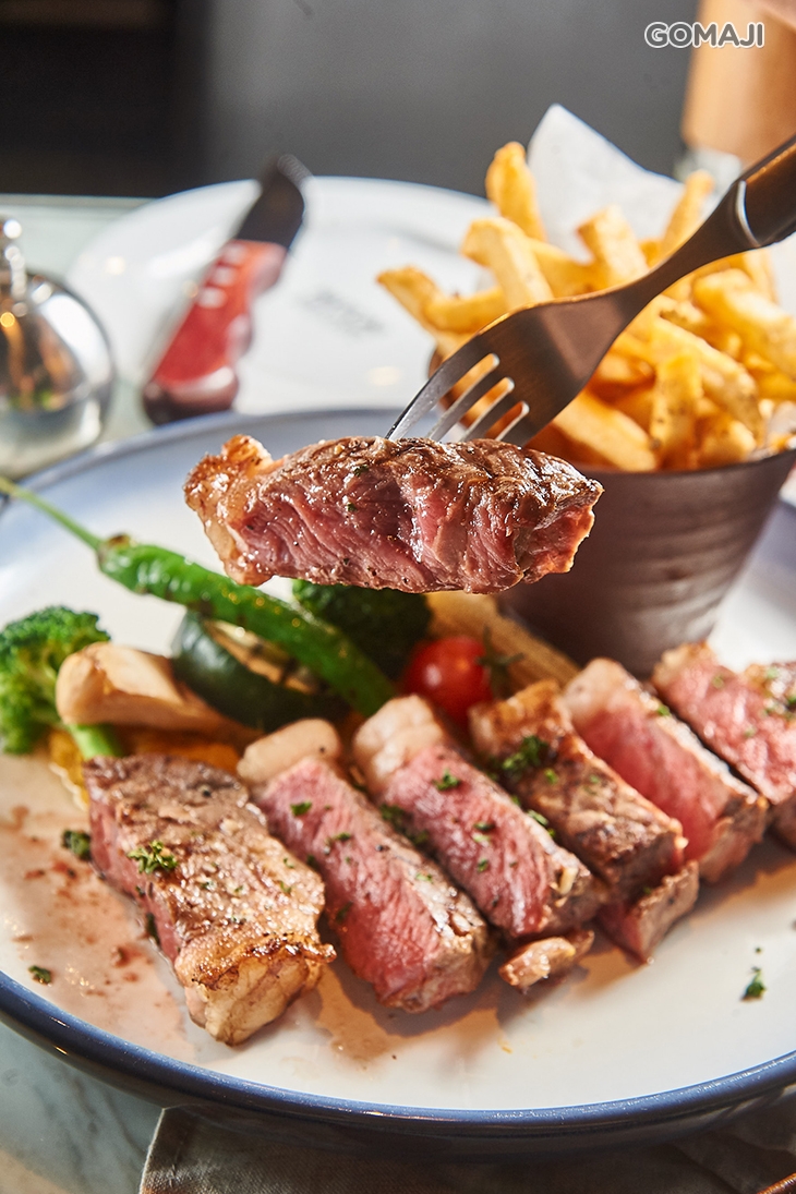 以濕式熟成的厚切紐約克牛排為主角,刀叉切下,牛肉軟嫩適中、粉嫩帶點油潤光澤,先不佐醬入口細嚐,肉嫩無比、汁鮮味香!閉上雙眼,彷彿能想像牛兒在嘴裡奔跑的畫面啊!