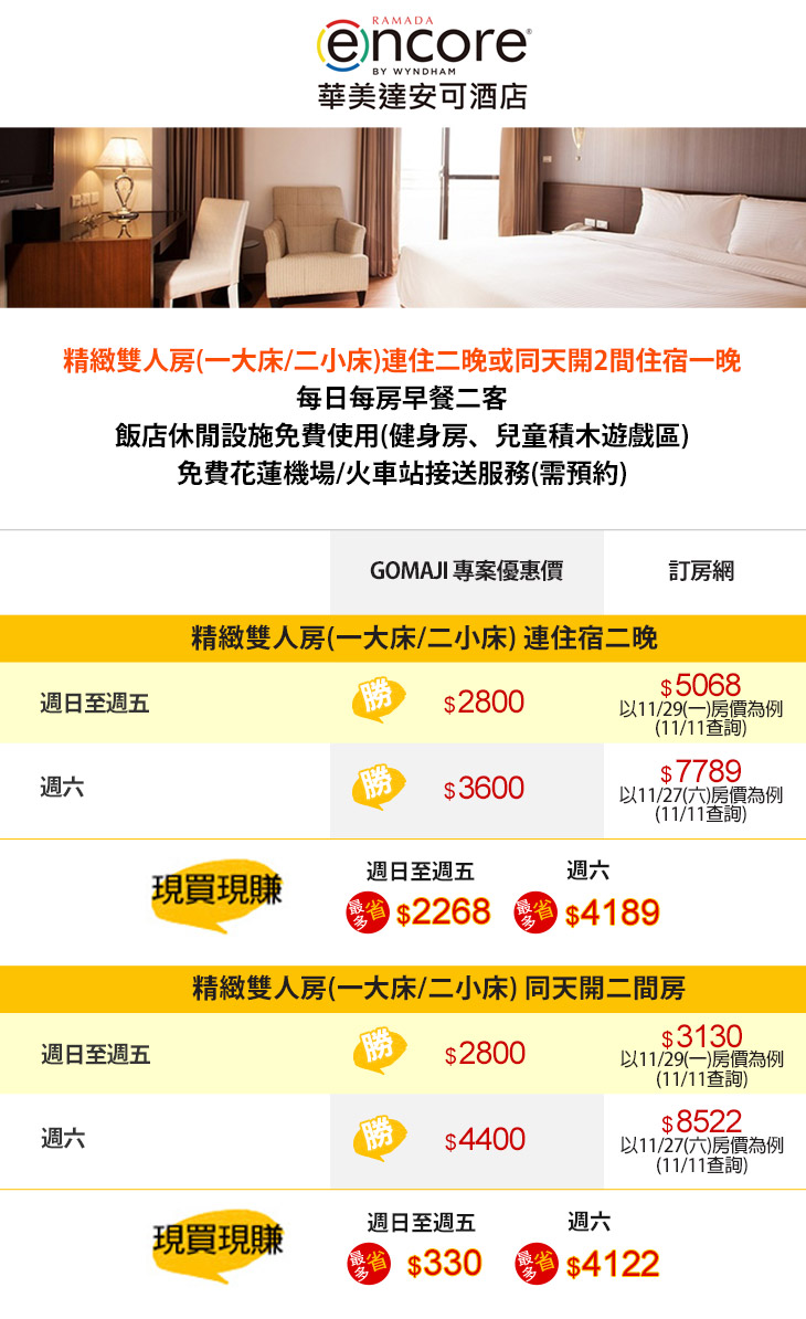 【花蓮力麗華美達安可酒店】感謝麻吉們熱烈搶購,已全數賣光光。