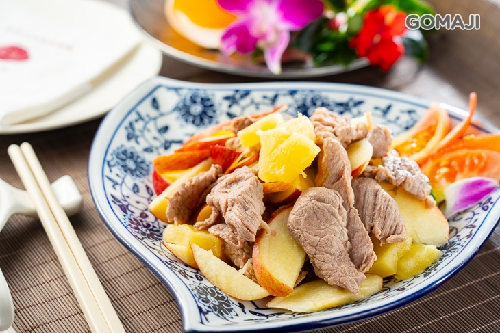 以上選沙朗牛為基底,加入季節性水果翻拌調味,軟嫩多汁且不柴的牛肉,入口綻放濃濃牛肉鮮香,與蘋果、番茄還有鳳梨相襯,果香四溢讓人越吃越起勁,直呼滋味爽口又清新喔!