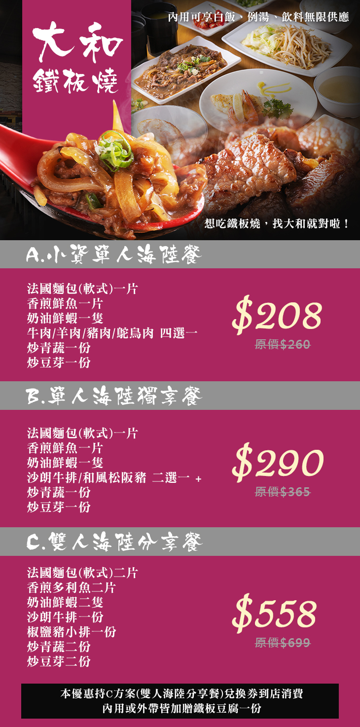 ★ 本優惠持C方案(雙人海陸分享餐)兌換券到店消費,內用或外帶皆加贈鐵板豆腐一份。