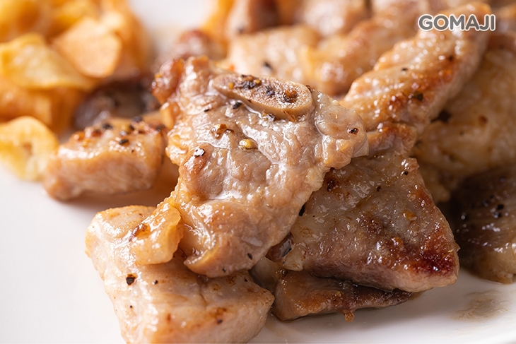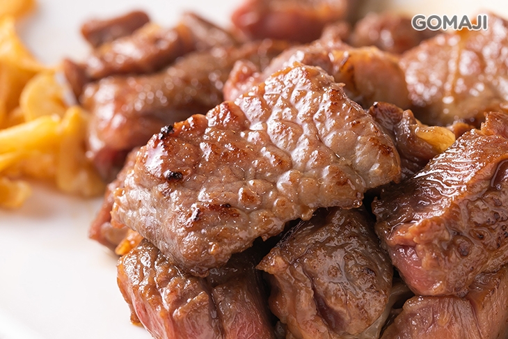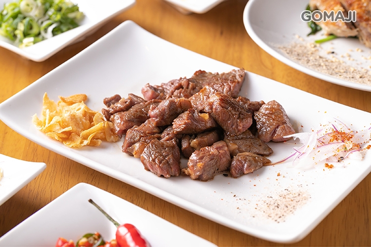 特選新鮮沙朗牛排,文火香煎,主廚以嫻熟的料理手藝,將牛排烹飪得軟嫩適中、多汁鮮美!搭配俐落的刀工,將牛肉迅速切塊盛盤上桌 ~ 油潤散發光澤的牛肉,香氣陣陣撲鼻,入口肉嫩味鮮,筋肉一咬即散的口感,讓人著迷!佐點蒜片或胡椒鹽享用,美味依舊、風味更佳。