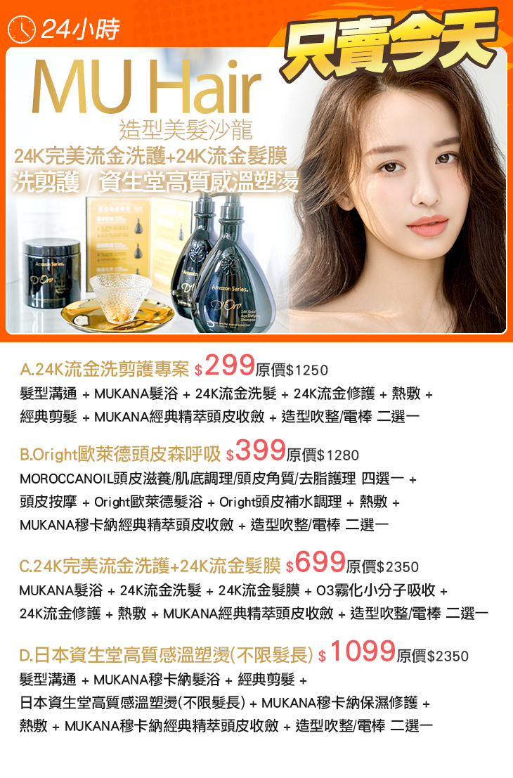 A.24K流金洗剪護專案 / B.Oright歐萊德頭皮森呼吸 / C.24K完美流金洗護+24K流金髮膜 / D.日本資生堂高質感溫塑燙(不限髮長)