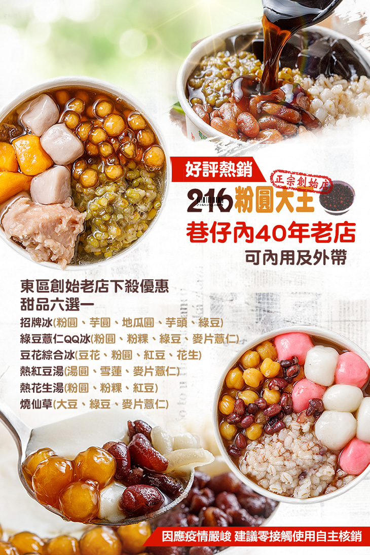 當年的創始粉圓攤,216 巷的傳奇,很多人不知道、沒聽過。沒關係,一切原由,在此道來。多年前,一位在六條通賣粉圓的歐吉桑,將紅心粉圓的製作技術傳授。當時台北東區 216 巷中,只有我們一攤在賣粉圓,歷經許多轉折與努力,始終堅持初心,以真材實料呈現最完美的口感,營業至今建立了良好口碑,是許多人心中最愛的粉圓選擇!這裡的產品堅持遵循古法,以純手工製作,自製自賣。各位舊雨新知,我們敢自豪的說:「這絕對是一家讓你吃過一次之後,還會再上門的店!」,歡迎大家來一同感受這香甜的幸福滋味!