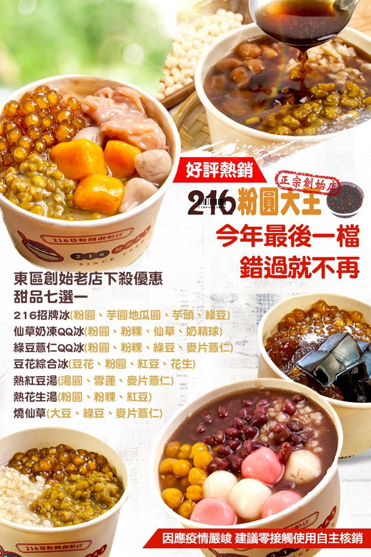 當年的創始粉圓攤,216 巷的傳奇,很多人不知道、沒聽過。沒關係,一切原由,在此道來。多年前,一位在六條通賣粉圓的歐吉桑,將紅心粉圓的製作技術傳授。當時台北東區 216 巷中,只有我們一攤在賣粉圓,歷經許多轉折與努力,始終堅持初心,以真材實料呈現最完美的口感,營業至今建立了良好口碑,是許多人心中最愛的粉圓選擇!這裡的產品堅持遵循古法,以純手工製作,自製自賣。各位舊雨新知,我們敢自豪的說:「這絕對是一家讓你吃過一次之後,還會再上門的店!」,歡迎大家來一同感受這香甜的幸福滋味!
