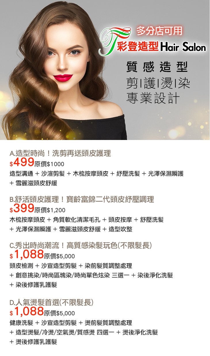 A.造型時尚!洗剪再送頭皮護理 / B.舒活頭皮護理!寶齡富錦二代頭皮紓壓調理 / C.秀出時尚潮流!高質感染髮玩色(不限髮長) / D.人氣燙髮首選(不限髮長)