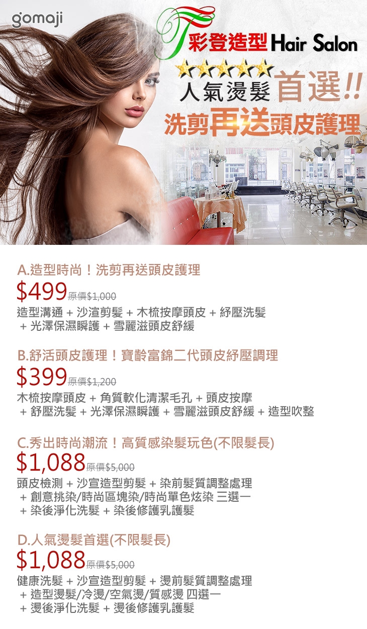 A.造型時尚!洗剪再送頭皮護理 / B.舒活頭皮護理!寶齡富錦二代頭皮紓壓調理 / C.秀出時尚潮流!高質感染髮玩色(不限髮長) / D.人氣燙髮首選(不限髮長)