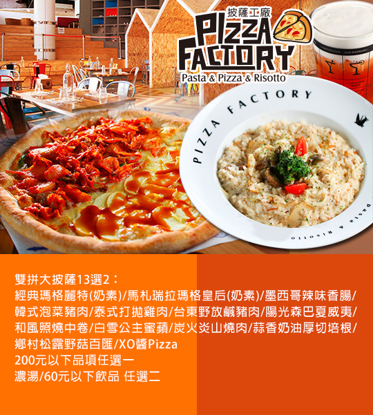 雙拼大披薩:經典瑪格麗特(奶素)/馬札瑞拉瑪格皇后(奶素)/墨西哥辣味香腸/韓式泡菜豬肉/泰式打拋雞肉/台東野放鹹豬肉/陽光森巴夏威夷/和風照燒中卷/白雪公主蜜蘋/炭火炎山燒肉/蒜香奶油厚切培根/鄉村松露野菇百匯/XO醬Pizza 13選2 + 200元以下品項任選一 + 濃湯/60元以下飲品 任選二