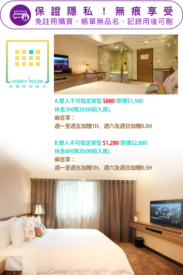 舒適無壓、備品齊全,柔和的燈光,搭配高質感的裝潢設計,呈現出簡約、典雅的愜意氛圍,希望來此的顧客都可以有「家的感覺」。兩人在這靜謐、不受干擾的小天地裡,可以盡情依偎著彼此,享受難得可貴、難以言喻的幸福感!