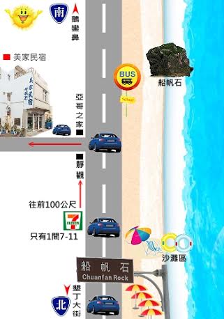 位於船帆石 7-11 前方 30 公尺處,第一條巷子左轉,即可看到【墾丁美家民宿】,屬家庭式民宿,房內的佈置雅緻又別具風情,每間房間都經過精心設計,乾淨素雅,備有停車場 15 坪左右及烤肉場地,可以欣賞船帆石美麗的海景,距離砂島、鵝鸞鼻國家公園等及墾丁大街只要 3~5 分鐘車程。