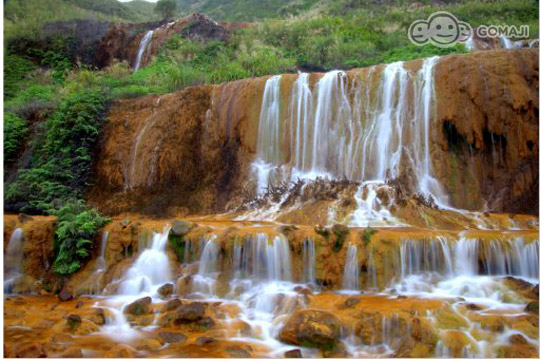 位於金瓜石往水湳洞的公路邊,早期曾經叱吒一時但現已廢棄的台金公司在金瓜石及九份產礦,由於這裡剛好山泉水與雨水滲入,礦砂沉積溪床,並有菌類附著滋生,水質飽含氧化的金屬礦石顏色,而形成金黃色的瀑布景觀,您可以到此拍照留念,欣賞這個顏色特別的黃金瀑布。
