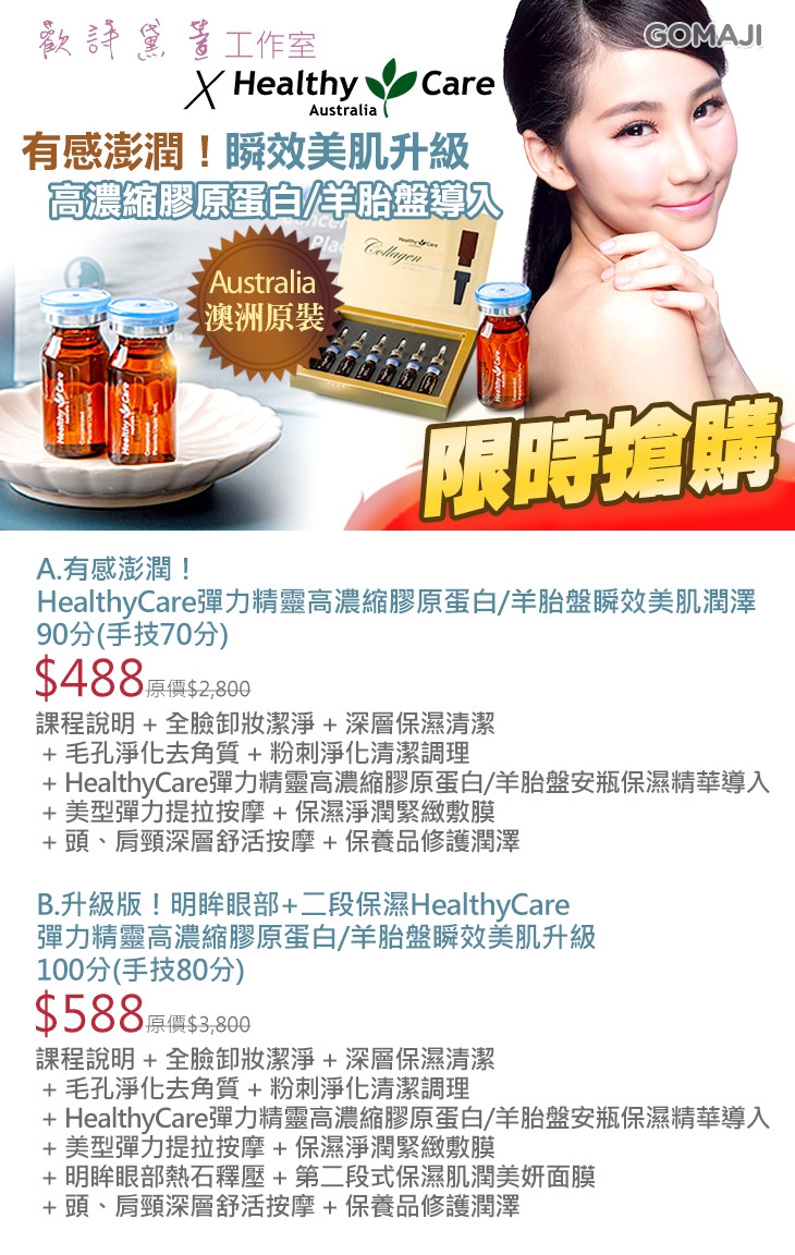 A.有感澎潤!HealthyCare彈力精靈高濃縮膠原蛋白/羊胎盤瞬效美肌潤澤90分(手技70分) / B.升級版!明眸眼部+二段保濕HealthyCare彈力精靈高濃縮膠原蛋白/羊胎盤瞬效美肌升級100分(手技80分)