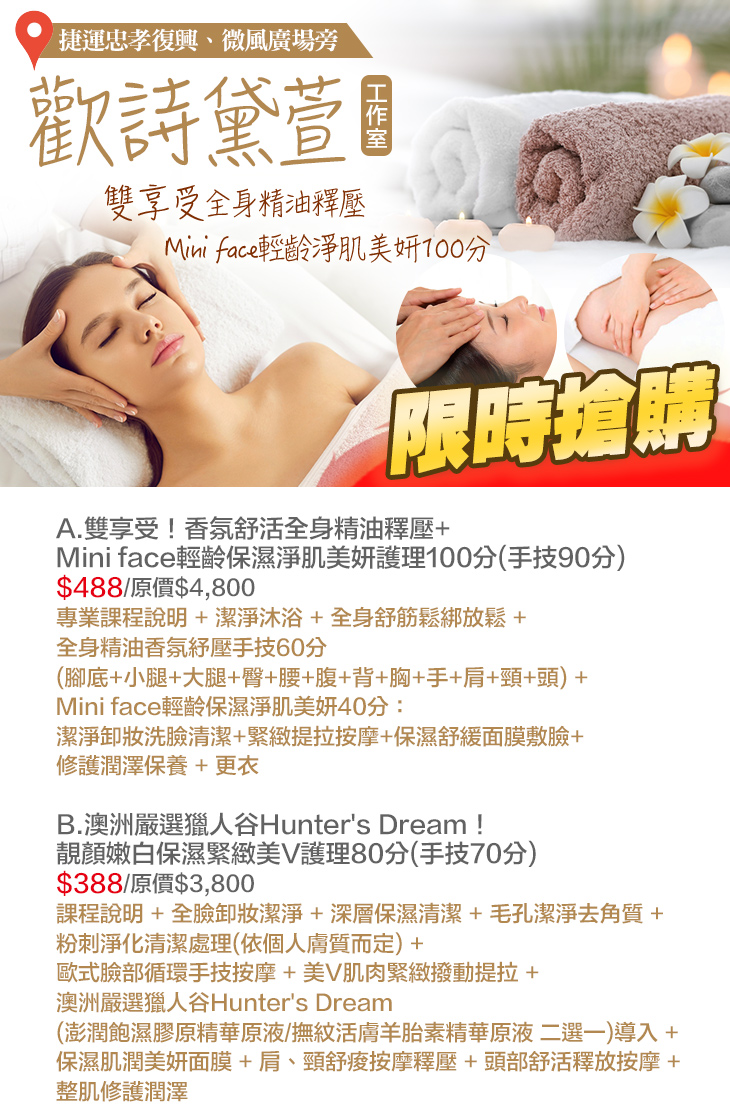 A.雙享受!香氛舒活全身精油釋壓+Mini face輕齡保濕淨肌美妍護理100分(手技90分) / B.澳洲嚴選獵人谷Hunter's Dream!靚顏嫩白保濕緊緻美V護理80分(手技70分)