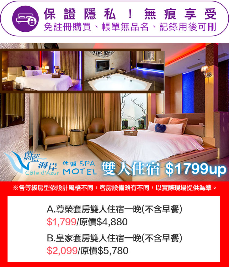 高畫質液晶電視、SPA蒸氣浴、VOD隨選電影、美國原裝獨立筒床墊、氣泡按摩浴缸、舒壓SPA花灑、情趣椅、繽紛絢麗星空彩繪、可調式情境燈光、獨立循環空調、專屬獨立車庫。