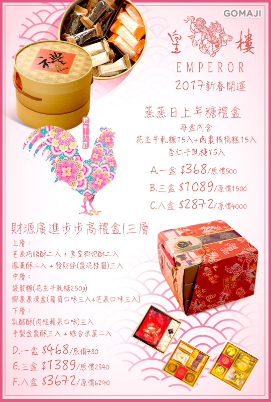A.2017新春開運-蒸蒸日上年糖禮盒一盒 / B.2017新春開運-蒸蒸日上年糖禮盒三盒 / C.2017新春開運-蒸蒸日上年糖禮盒八盒 / D.2017新春開運-財源廣進步步高禮盒一盒(三層) / E.2017新春開運-財源廣進步步高禮盒三盒(三層) / F.2017新春開運-財源廣進步步高禮盒八盒(三層)