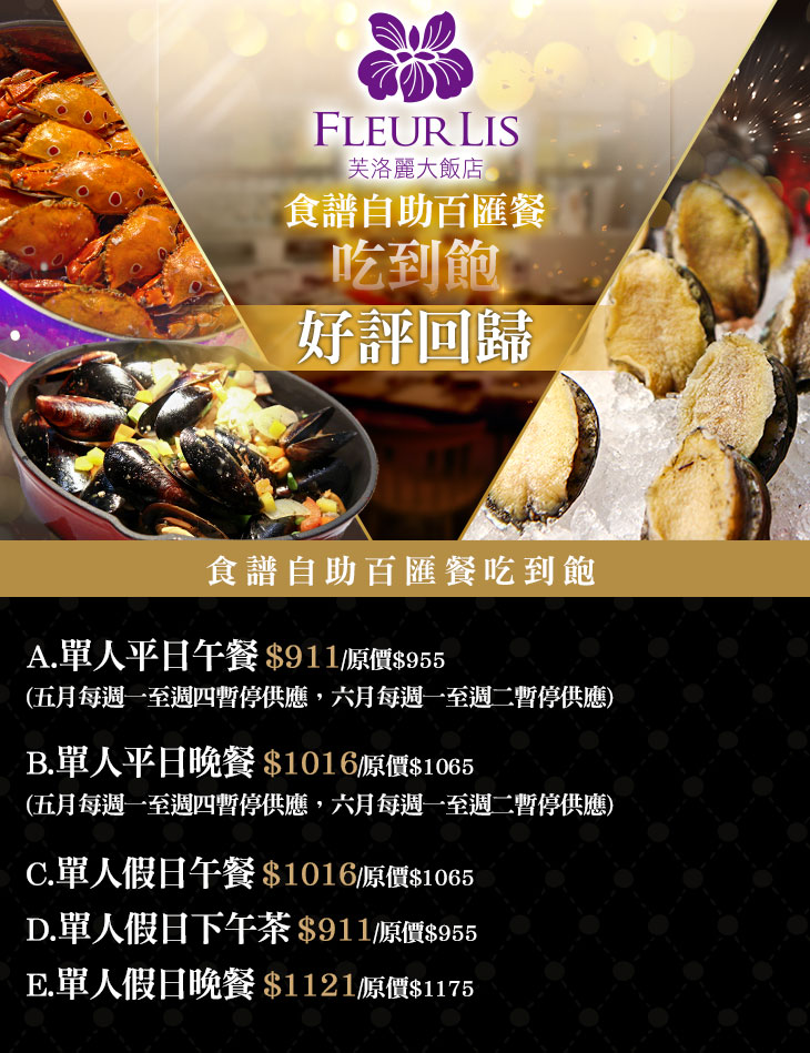 A.單人平日午餐食譜自助百匯餐吃到飽 / B.單人平日晚餐食譜自助百匯餐吃到飽 / C.單人假日午餐食譜自助百匯餐吃到飽 / D.單人假日下午茶食譜自助百匯餐吃到飽 / E.單人假日晚餐食譜自助百匯餐吃到飽