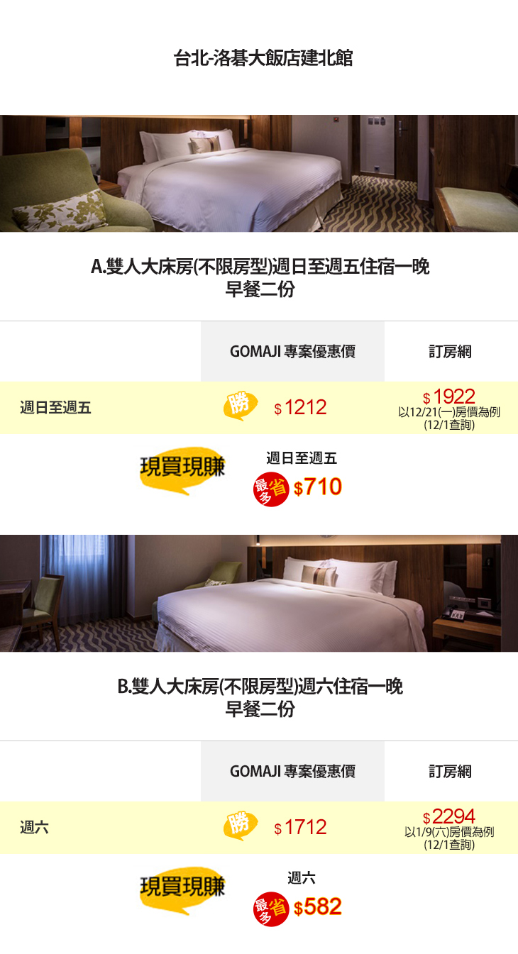 【台北-洛碁大飯店建北館】感謝麻吉們熱烈搶購,已全數賣光光。