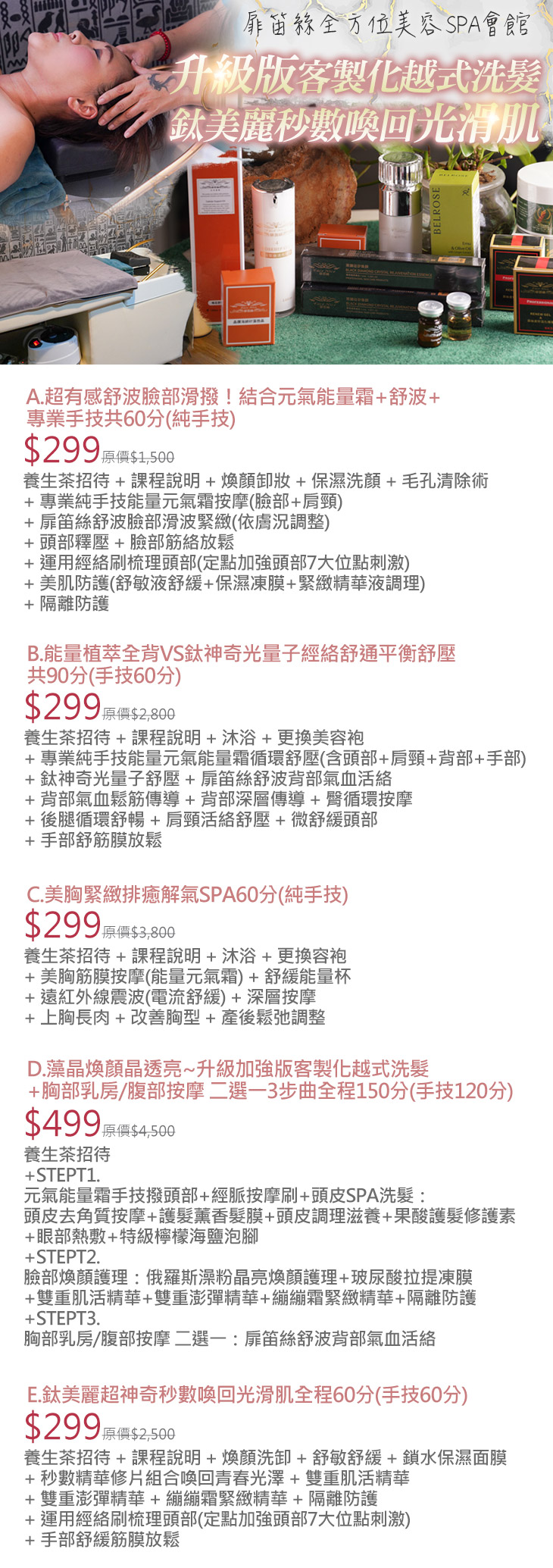 A.超有感舒波臉部滑撥!結合元氣能量霜+舒波+專業手技共60分(純手技) / B.能量植萃全背VS鈦神奇光量子經絡舒通平衡舒壓共90分(手技60分) / C.美胸緊緻排癒解氣SPA60分(純手技) / D.藻晶煥顏晶透亮~升級加強版客製化越式洗髮+胸部乳房/腹部按摩 二選一3步曲全程150分(手技120分) / E.鈦美麗超神奇秒數喚回光滑肌全程60分(手技60分)