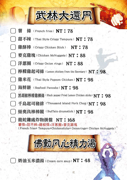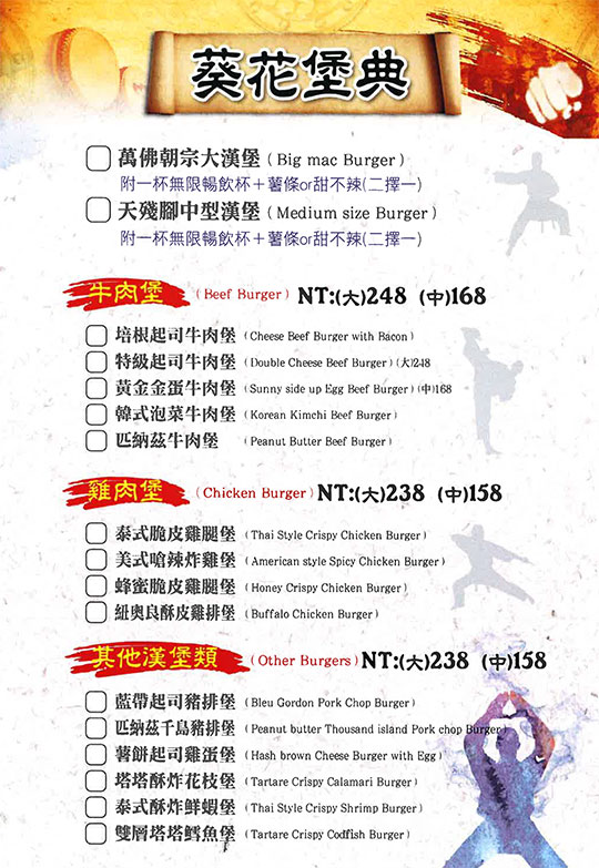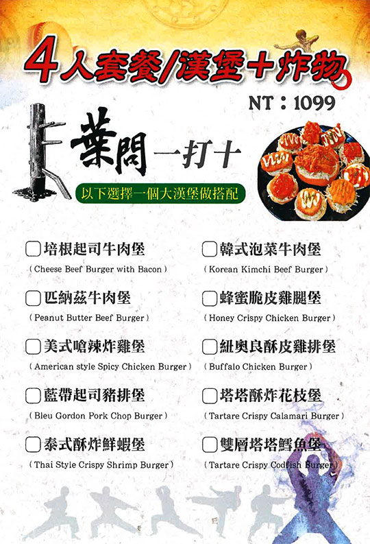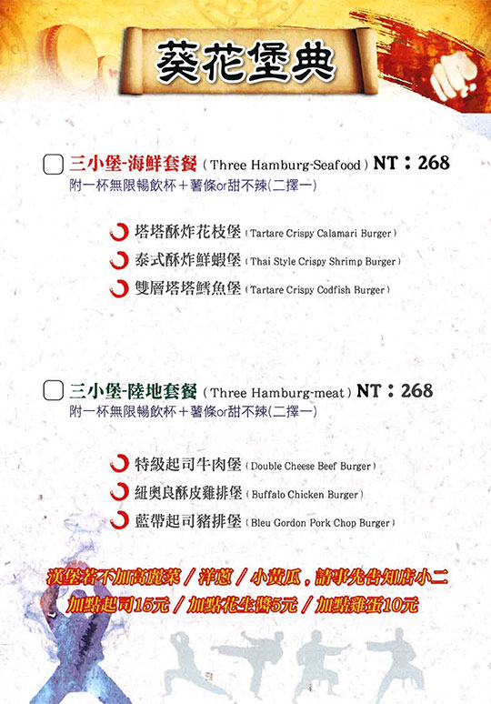 特別推薦:三小堡-海鮮套餐、三小堡-陸地套餐、特級起司牛肉堡、美式嗆辣炸雞堡、龍蛇雜處炸物拼盤、普羅旺斯紐奧良雞腿排堡