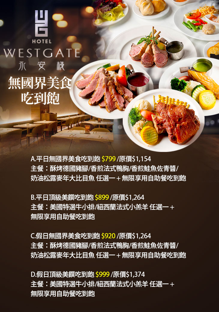 A.平日無國界美食吃到飽 / B.平日頂級美饌吃到飽 / C.假日無國界美食吃到飽 / D.假日頂級美饌吃到飽